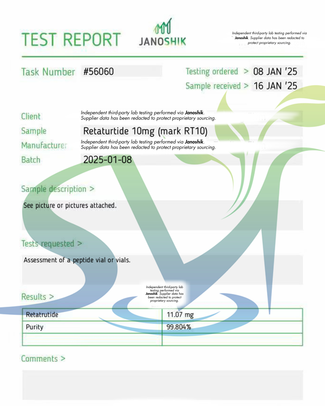 - Total Amount of Active Ingredient: 10mg Retatrutide